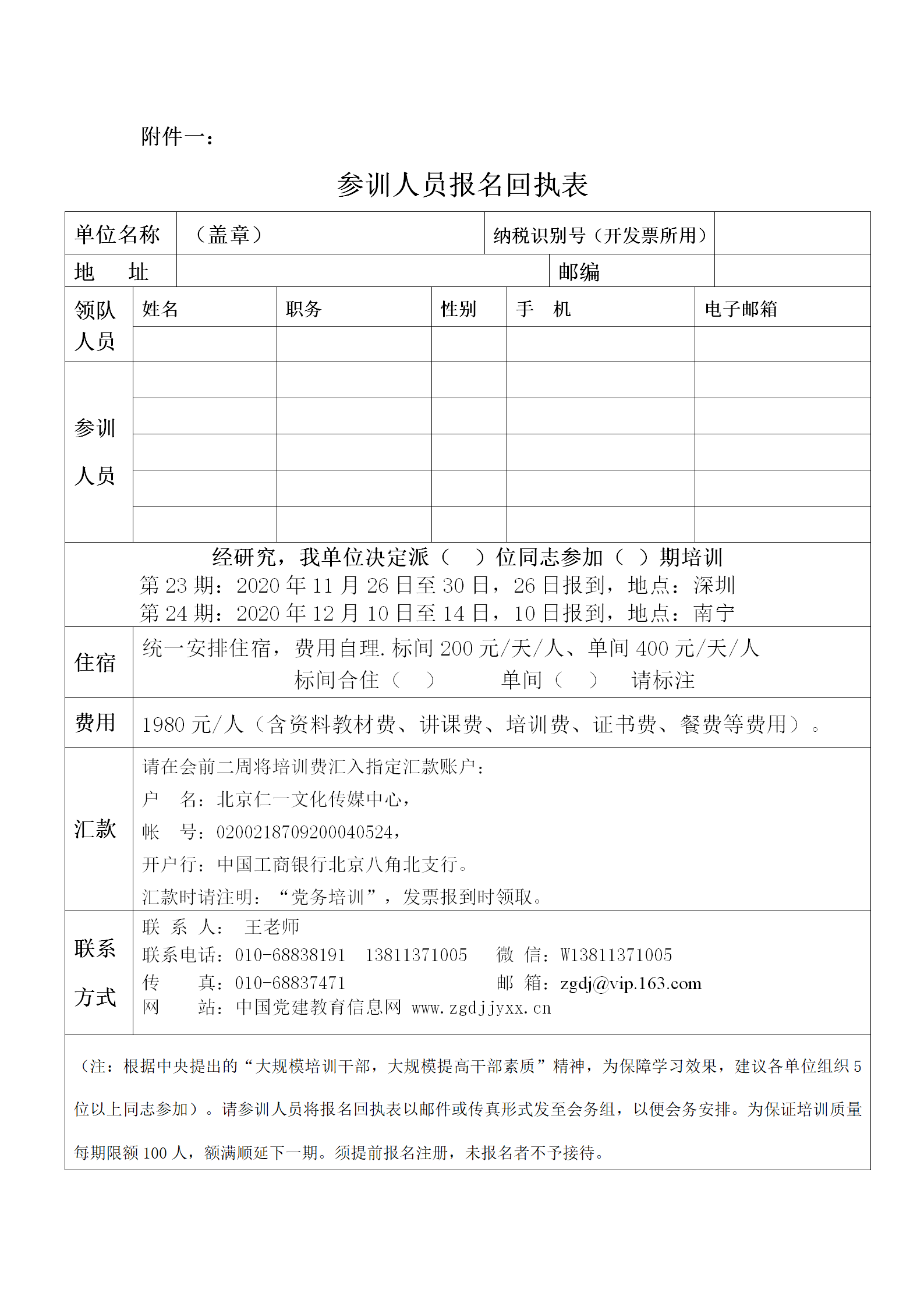 附件一:参训人员报名回执表
