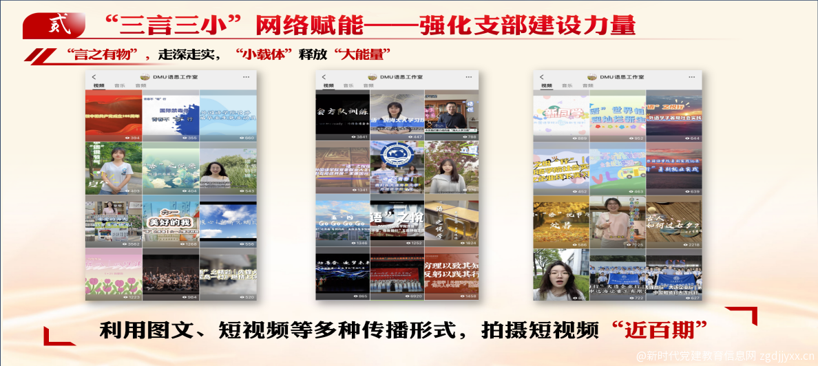 1、言之有物,走深走实:“小载体”释放“大能量”。构建以“语思”网络空间站为一体,以易班网、学工平台、蓝梦红心公众号为三翼的融媒体矩阵。在内容上求“准”、求“新”、求“微”、求“快”。拍摄制作“党史外语微课堂”、“志愿服务暖心瞬间”、“学霸笔记分享”等短视频近百期,使党员教育管理服务突破时空限制,增强吸引力和覆盖面。